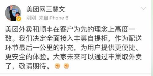 美团点评餐饮平台总裁王慧文发表微博:“美团外卖和顺丰在客户为先的理念上高度一致。我们决定全面接入丰巢自提柜,作为配送环节最后一公里的补充,为用户提供更便捷、更安全的体验。大家未来可以通过丰巢取外卖了,敬请期待。”