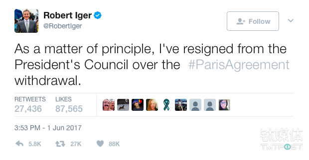 马斯克并不是经济顾问团队里唯一一位请辞的。迪士尼CEO罗伯特·艾格(Robert A. Iger)紧随其后也在推特上宣布,“这是一个原则问题,因为美国退出巴黎协定,我决定从总统委员会辞职。”