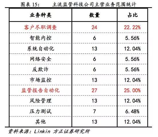 而来自Linkin方正证券研究的数据显示,监管报告自动化、客户尽职调查、系统自动化、市场监控等为主流监管科技公司的主要主营业务,其中监管报告自动化和客户尽职调查的占比最多,都超过了20%。