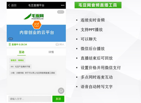 而致力于为内容创业者服务的毛豆网,把2016年带来的内容创业的热潮与音视频浪潮相结合,通过音频直播去服务内容创业,成为了内容创业者最坚实的技术后盾。