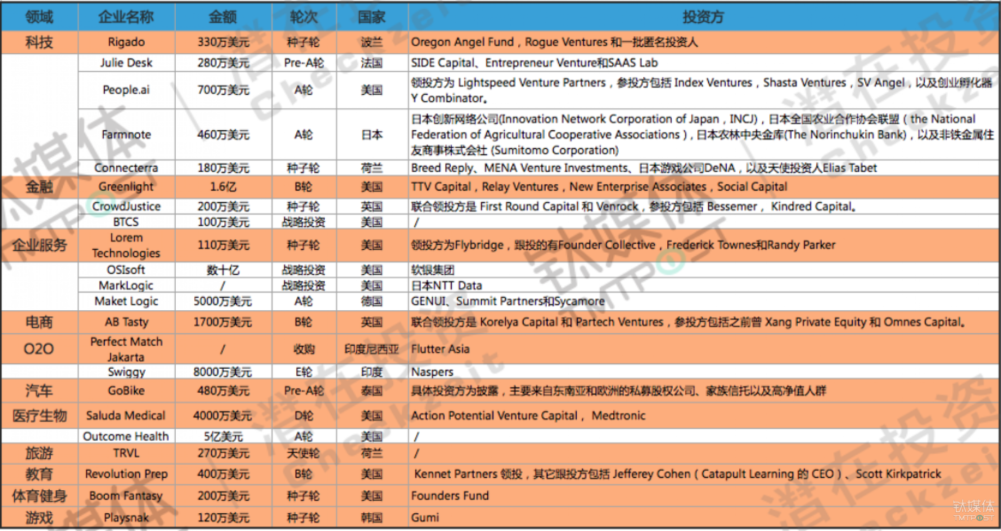✔️. 本周投资机构Naspers依旧活跃,上月投资4.31亿美元到美国在线外卖平台Delivery Hero,本周印度线餐饮平台Swiggy获得来自Naspers的8000万美元E轮融资。
