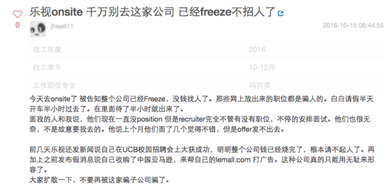 在美国华人工程师论坛“一亩三分地”中,一名网名为jfree811的网友在结束乐视的面试后写下了“乐视onsite,千万别去这家公司,已经freeze不招人了”的帖子。