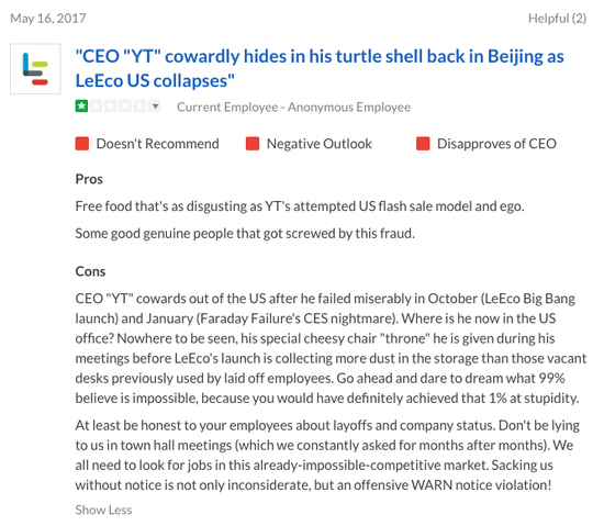 在一封名为《 贾跃亭在北美全线溃败后,懦弱地回到北京躲在龟壳里》的评价里,一位员工在5月16日指出了公司在“不诚实”地裁退员工——不仅不能诚实公布公司当前的状况,甚至继续为员工画大饼忽悠。