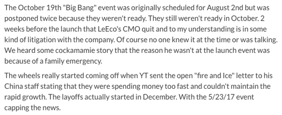 不过, Big Bang发布会背后还有更多的内幕。“这场预计安排在8月2日的活动被一拖再拖,至少拖延两次才安排到10月进行的。实际上,乐视到10月也没有完全准备好。在发布会前两周乐视CMO因为和公司的诉讼突然从公司离职。当然,最终他没有来到现场,更无法按照最初的安排演讲。而对员工,公司只是表示这位高层家中有急事。”