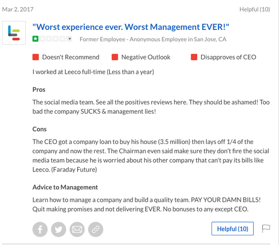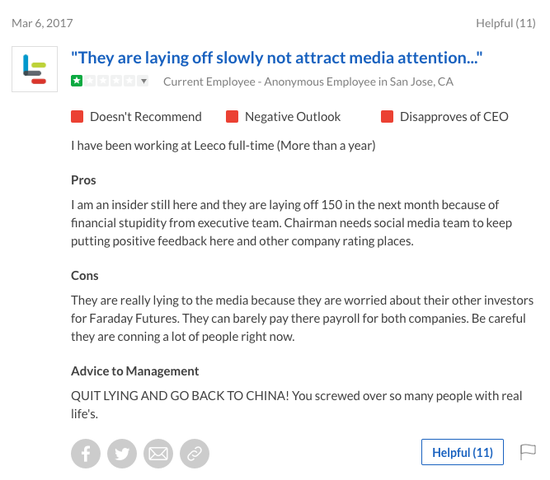 “我还在乐视,但是目前因为他们资金链问题,正在计划在下月裁撤150人。不过乐视唯一不想裁撤的就是社交媒体团队——他们需要一直,一直,一直在这里(Glassdoor)和其他一切可以给乐视评分的地方当水军,刷假评论。乐视一直在对媒体说谎,因为他们太害怕这会影响到法拉第未来的其他股东的决定。”