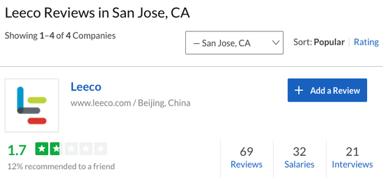 不过比起水军刷评论更尴尬的是,哪怕算上这些虚假的夸赞,在满分5分的情况下,乐视在Glassdoor上的评分竟然也只有少的可怜的1.7分。