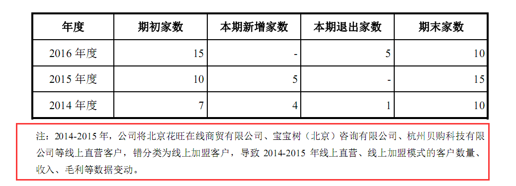 虽然“淘品牌”的上市背后有阿里的默默支持,但在十月妈咪的招股书中却错误频出这也折射出其上市经验的不足。据十月妈咪最新披露的招股书显示“2014-2015年,公司将北京花旺在线商贸有限公司、宝宝树(北京)咨询有限公司、杭州贝购科技有限公司等线上直营客户,错分类为线上加盟客户,导致 2014-2015 年线上直营、线上加盟模式的客户数量、收入、毛利等数据变动。”该问题反映出十月妈咪在客户成分划分这一基本概念上还存在不足,经过近一年的反馈期该问题才得以更正。