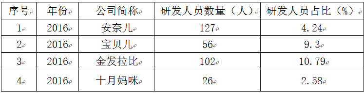 据十月妈咪招股书显示“公司专注于品牌运营,业务集中于产业链上具有较高附加值的产品创新和研发设计、品牌推广、销售渠道建设等核心环节”。但其研发人员数量由2015年的36人缩减至2016年的26人,人员占比由3.52%下降至2.58%。这一数据与其类比公司金发拉比、安奈儿、宝贝儿相比较为薄弱。虽然这并不能完全说明企业的研发实力,但研发人员数量却是一项不容忽视的指标。