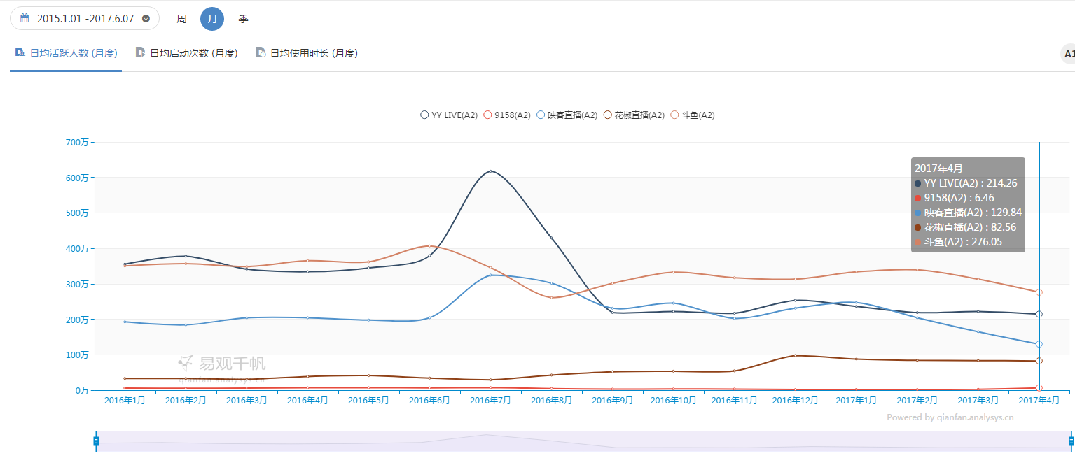 2016年1月至2017年4月部分直播平台DAU变化,可以看出直播平台流量在2016年7月有明显下滑(数据来源于易观千帆)