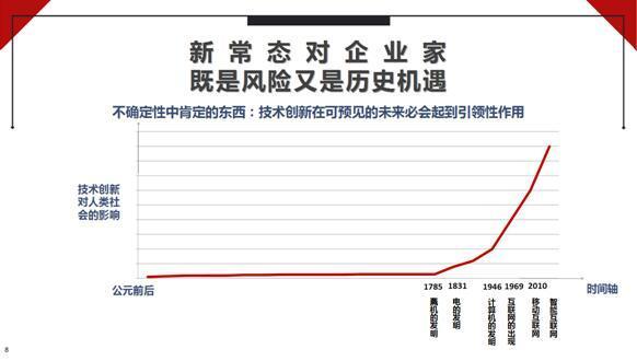 这个图的纵坐标是技术创新对人类社会的影响,横坐标是时间轴,这是我的一个感性认识。1800年前整个人类社会的发展非常缓慢,科技技术的变革对人类社会的影响都是很少的。到什么时候出现了一个重要的拐点呢?应该讲是从计算机的发明开始,特别是个人电脑的发明跟互联网、移动互联网发展起来以后,智能互联网的出现就会使这个曲线陡直地上行。