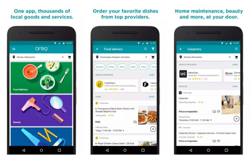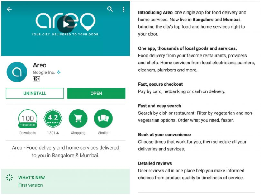 当然,谷歌要做的事情,绝不会是仅投放一个广告那么简单。 4月13日,谷歌在旗下应用商店内发布了一款名为“Areo”的安卓应用。现阶段,Areo 主要为食品和服务公司提供在线订餐和家政O2O服务,而且业务仅覆盖班加罗尔和孟买两座城市。