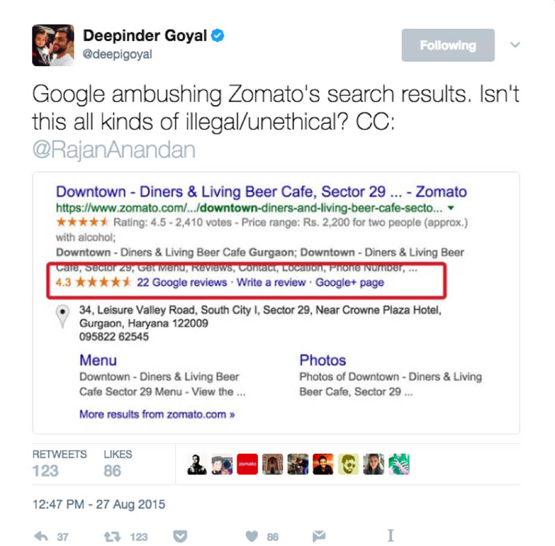 Zomato 公司创始人 Deepinder Goyal 在 2015 年 8 月 27 日发表的推文截图