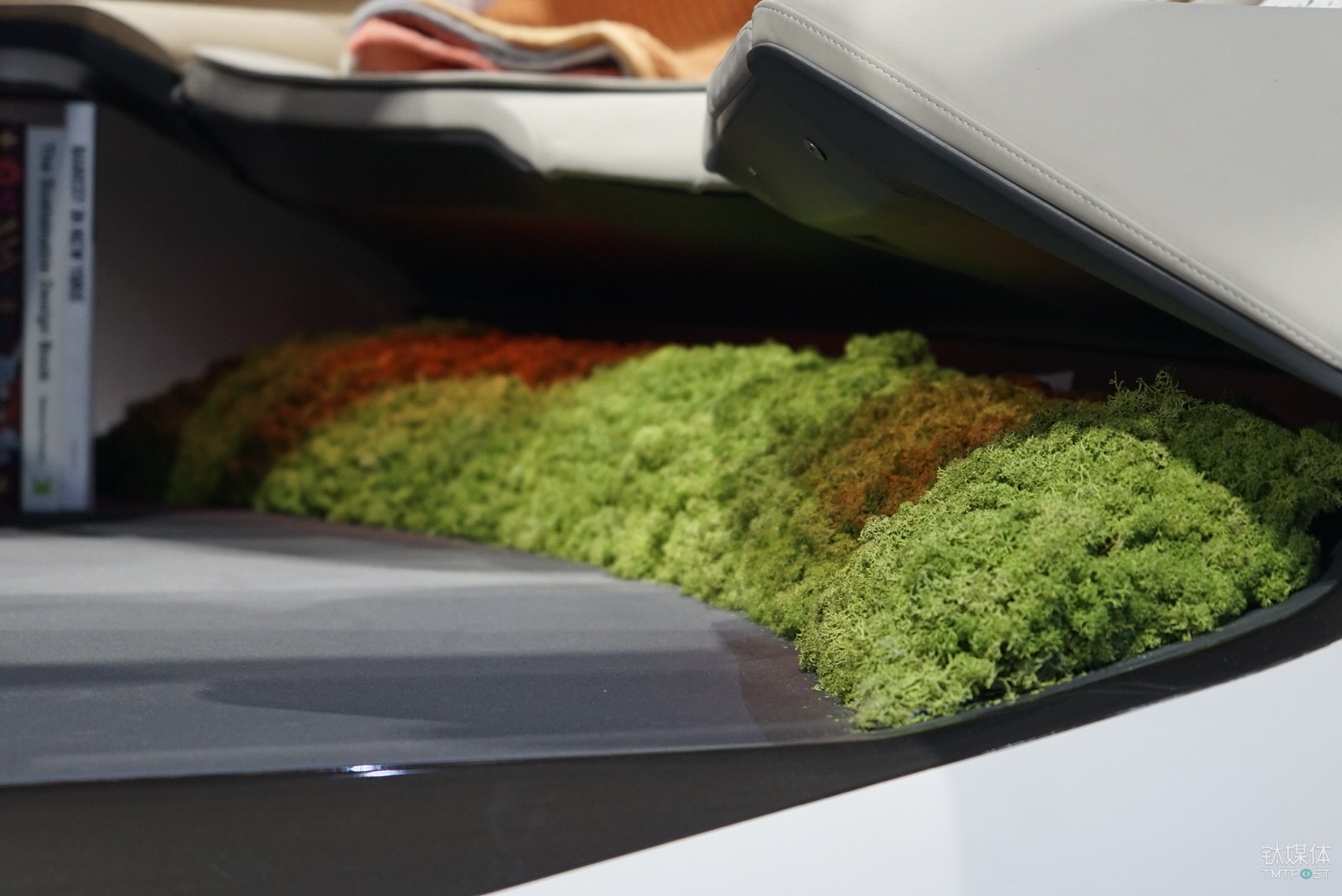 这款概念座舱除了科技智能化需求,也充分满足了用户对舒适性和便捷性的要求。比如在后排座椅一侧加入了木质书架,让座舱内更具生活气息,而后排座椅下部毛茸茸的绿色装饰物则是来自瑞典的天然苔藓,具有优化车内声学的作用。