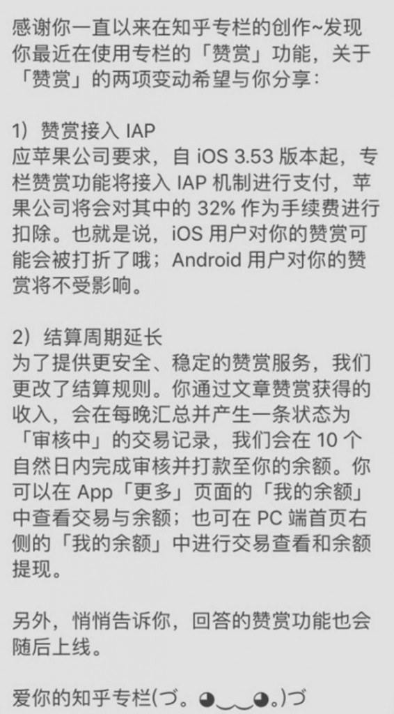 钛快讯 | 国内问答平台知乎旗下账号知乎于6月9日,在专栏发布公告称,应苹果公司的要求,从iOS3.5.3版本的知乎App更新之后,专栏赞赏功能将接入IAP付费机制,苹果公司将从中扣除32%作为手续费,也就是说,用户只能获得剩下的68%的赞赏分成。