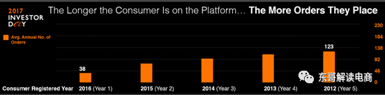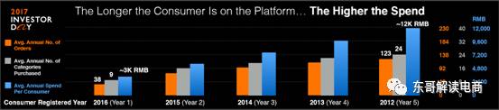 以此类推,2015财年增加的用户在2017财年其实已经接近了购买力的最高增速,2014财年增加的用户更是在2016财年就接已经近顶峰,这些人对未来几年的GMV贡献不大。