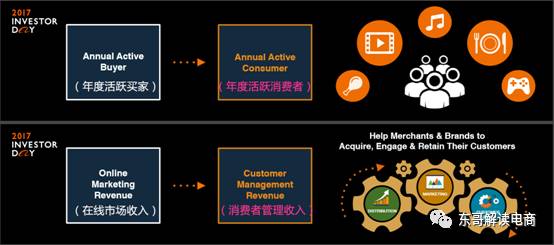 但,我们要重点说明的是,阿里巴巴这次抛出的核心要点是,未来阿里巴巴核心电商业务将不再依托用户数量来增长,而是质量,对阿里巴巴来说,核心电商收入不仅来自于在线市场本身,更来自于消费者运营——帮助商家和品牌获得、运营、留存消费者。