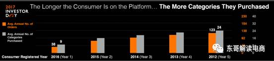 然后,武卫详细解读了“越老的用户,价值越高”(主要表现在3个方面,老用户的订单更多,购买的品类更多,消费更高)。
