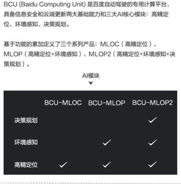 BCU具备信息安全和云端更新两大基础能力和三大 AI 核心模块:高精定位、环境感知、决策规划。现在开发出来的三个手掌大小的系列产品: