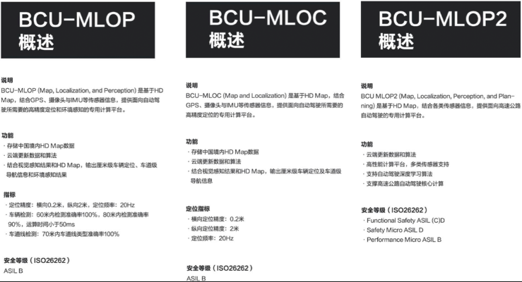 BCU-MLOC定位于提供高精度定位的计算平台,BCU-MLOP是定位于提供高精度定位与环境感知的计算平台,而BCU-MLOP2则在高精地图定位、环境感知之外,还提决策规划的计算平台。三者的指标如下图(百度官方指标):