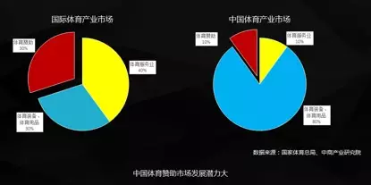 从国内来看,中国体育赞助市场潜力巨大,在国际体育市场中,中国体育服务占比大约在70%,而中国的体育市场和国际相比还不够成熟,处于发展初期阶段,这其中有30%是体育赞助行为。体育市场主要以体育装备和体育用品为主,体育服务占比大约20%,体育赞助的占比份额更是少的可怜,所以未来体育赞助市场更是蕴藏着巨大潜力。