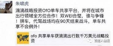 一直到9月,滴滴宣布战略投资ofo,市场开始真正沸腾。朱啸虎趁势在朋友圈立下军令状:共享单车的战争将在90天内结束——这为多家媒体贡献了好标题。