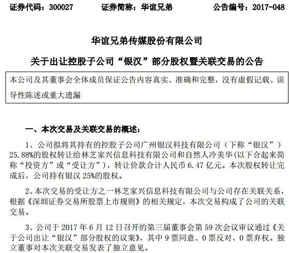 就在昨日,华谊兄弟发布公告,以6.47亿对价,将银汉科技25.88%的股份转让给腾讯的关联公司,林芝家兴信息科技有限公司,以及自然人冷美华。