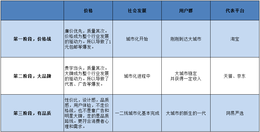 在这个阶段,电商刚刚进入人们的生活。电商在用户心目中成了廉价的代名词,人们坚定的认为只要是网上买的东西就应该是便宜的。用户消费的主要指标就是关注价格。越便宜的东西越受欢迎。廉价优先,质量其次。价格成为整个行业发展的驱动力。所以导致了1元包邮等模式爆发。