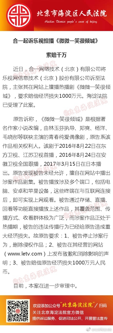 根据海淀法院所提供的的信息显示,原告诉称,《微微一笑很倾城》是根据著名作家小说改编,由林玉芬执导、郑爽、杨洋、毛晓彤等联袂主演的青春纯爱偶像剧,原告系该作品相关权利人。该剧于2016年8月22日在东方卫视、江苏卫视首播,2016年8月24日在安徽卫视全国跟播,2017年3月15日在日本播出。
