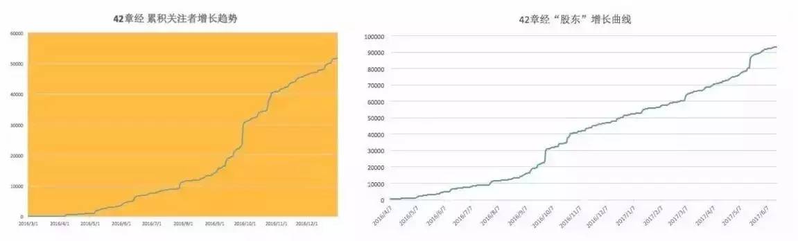 与其他微信公众号不同,42章经并不介意公布自己的粉丝数量。年初,曲凯就晒出了42章经的订阅用户增长曲线,当时5万多的粉丝并不算多,但对面向投资人这样一个深度而垂直的公众号来说,也算是一个耀眼的成绩。用曲凯自己的话说就是:“短时间内积累了超过 50000 关注者,远超业内水平的平均阅读量”。