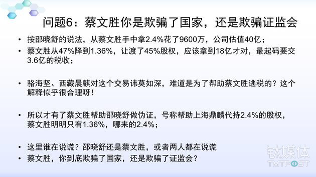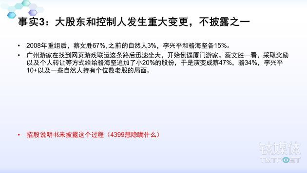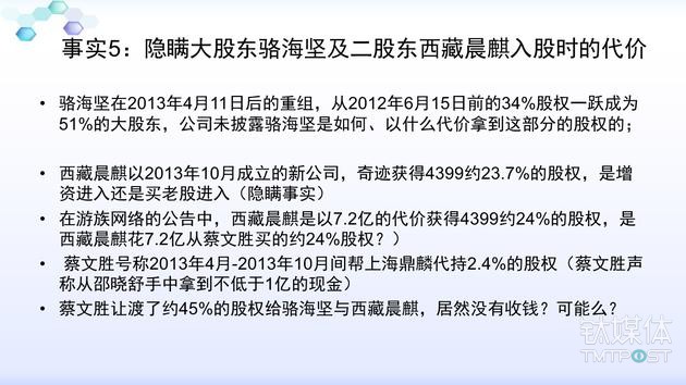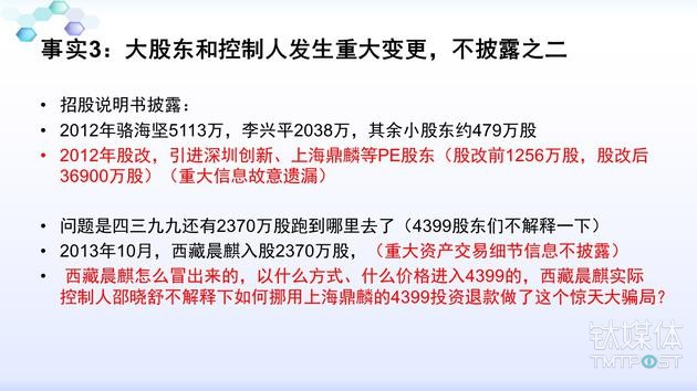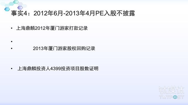 鼎麟方面还称,蔡文胜曾在2013年持有4399的股权从47%直接降到1.36%,正常来讲股东的这种变动是要在公开文件中披露出来的,但是并没有披露。鼎麟方面称,蔡文胜股权的减少,很有可能就是当时他将鼎麟投给游族的9600万元和股权转给了邵晓舒。