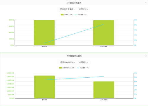 阿星连忙打开了 “艾瑞指数”来证实,结果二者在App的月活独立设备、日活设备的用户量上大体相当,甚至摩拜在App在月度数据时长上还领先于ofo的App。凭此推断,朱啸虎转发的是应该是ofo的PR稿,单独把ofo在日活独立设备增速上的领先摩拜App拎出说事。(请读者朋友仔细看以下艾瑞指数第一张截图的蓝色曲线,就明白ofo所指了)