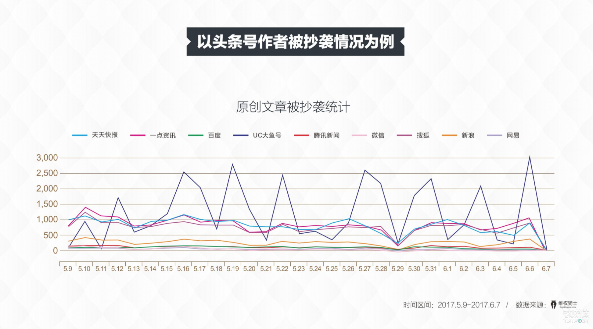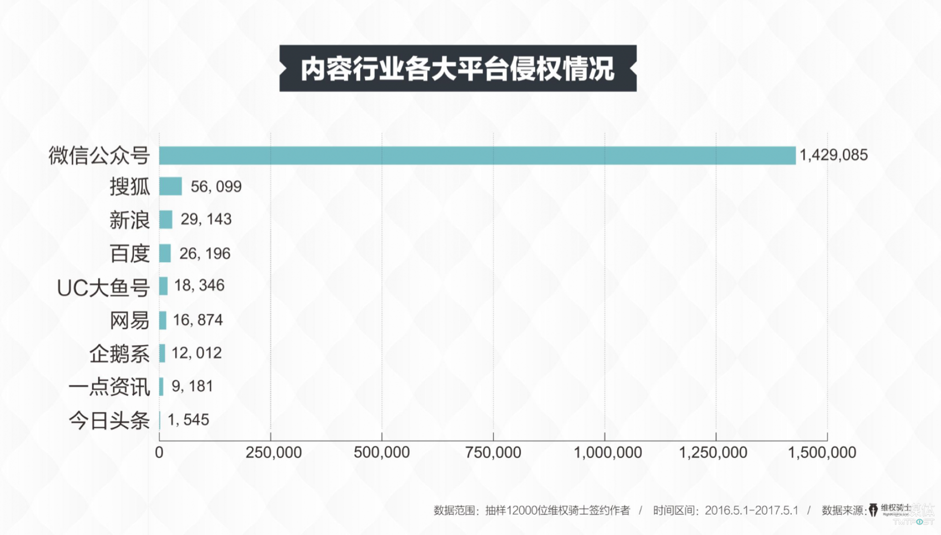 维权骑士抽样了12000名签约作者,数据显示,在2016年5月1日至2017年05月1日期间,这些签约作者共被几大内容平台侵权高达160万次。其中,仅微信公共号平台侵权142万次,其次为搜狐、新浪、百度等平台。