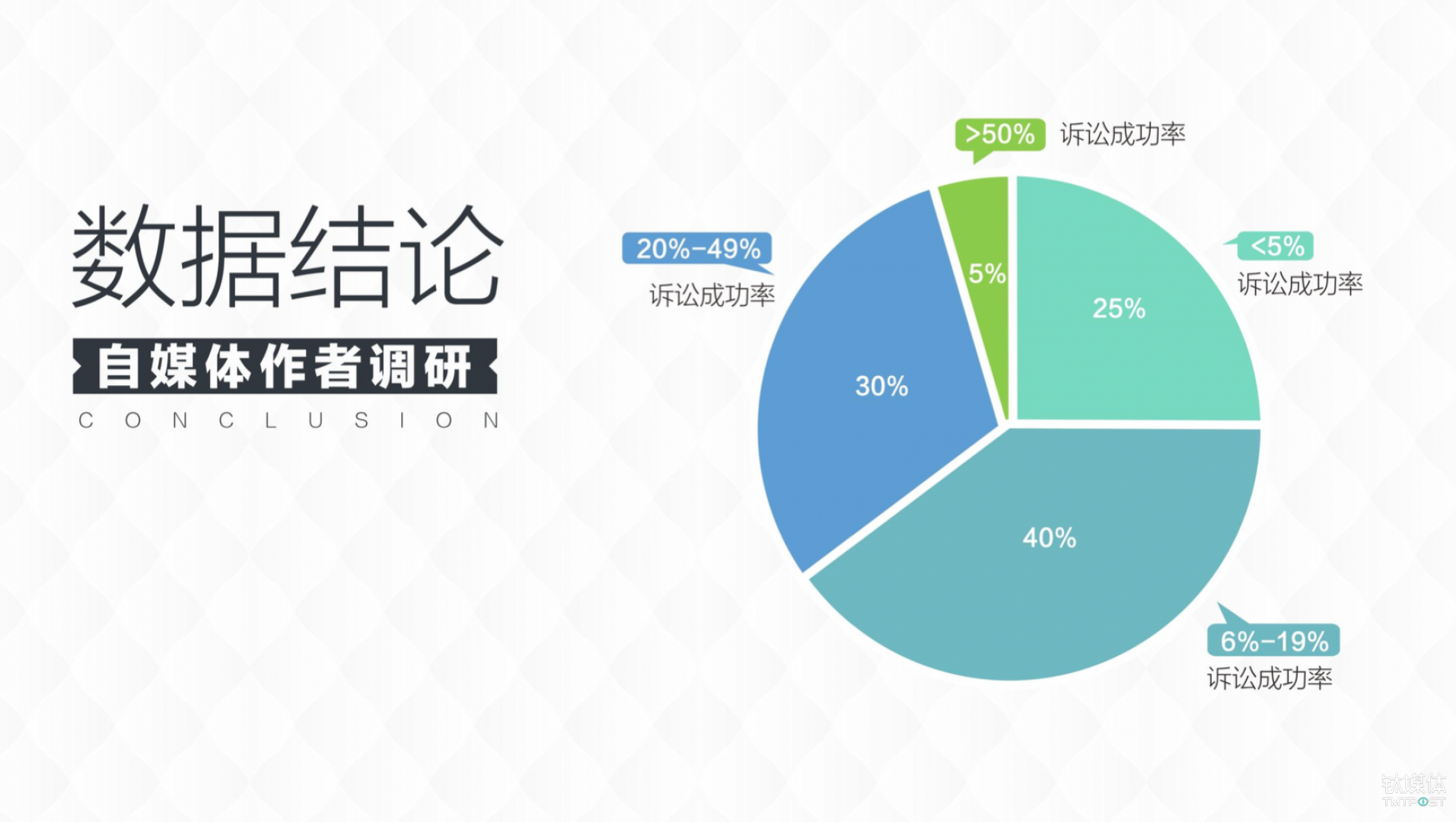遭遇被抄袭,自媒体人选择诉讼的成功率往往也很低,这导致了自媒体人自己维权的积极性并不高。在维权骑士的调研显示,自媒体人诉讼维权的成功率极低,诉讼成功率在一半以上的仅有5%。