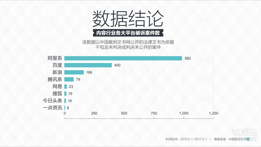 因此,根据报告显示,在过去的一年中,阿里系是在内容行业诉讼案件数量最多的平台,其高达982起,百度第二,涉及内容行业的诉讼案共计400起,新浪第三。