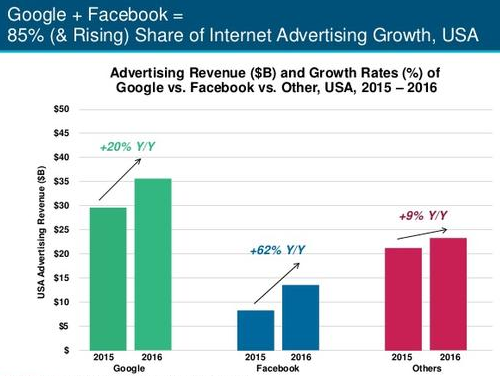 关于谷歌和Facebook在数字广告市场的垄断趋势,“互联网女皇”Mary Meeker在其最新的报告中也有所提及。尽管目前“双头垄断”局面一时之间难以打破,但随着时代和技术的进一步发展 ,新企业也未必不能够实现“破局”,届时会出现新的广告形态也未可知。
