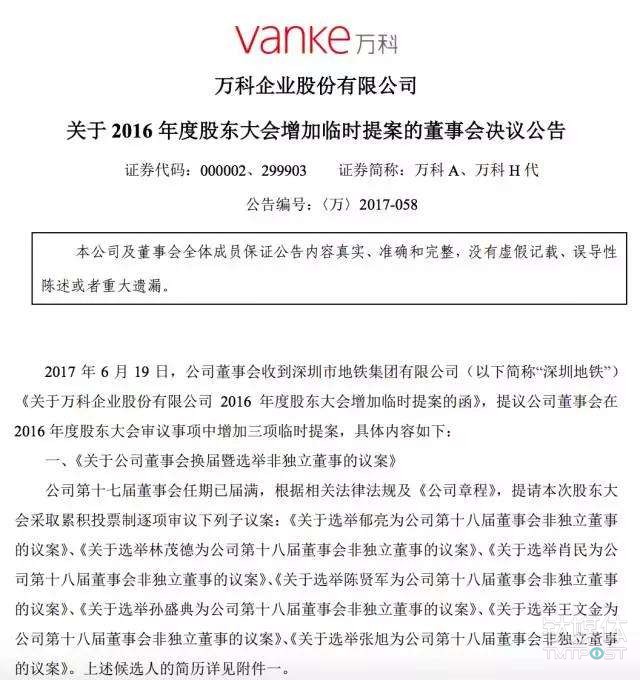 万科公告称,2017 年 6 月 19 日,公司董事会收到深圳市地铁集团有限公司(以下简称“深圳地铁”)出具的《关于万科企业股份有限公司 2016 年度股东大会增加临时提案的函》,深圳地铁提请在 2016 年度股东大会审议事项中增加《关于公司董事会换届暨选举非独立董事的议案》、《关于公司董事会换届暨选举独立董事的议案》、《关于公司监事会换届暨选举非职工代表监事的议案》三项临时提案。经审议,董事会同意将上述三项临时提案提交 2016 年度股东大会决议。