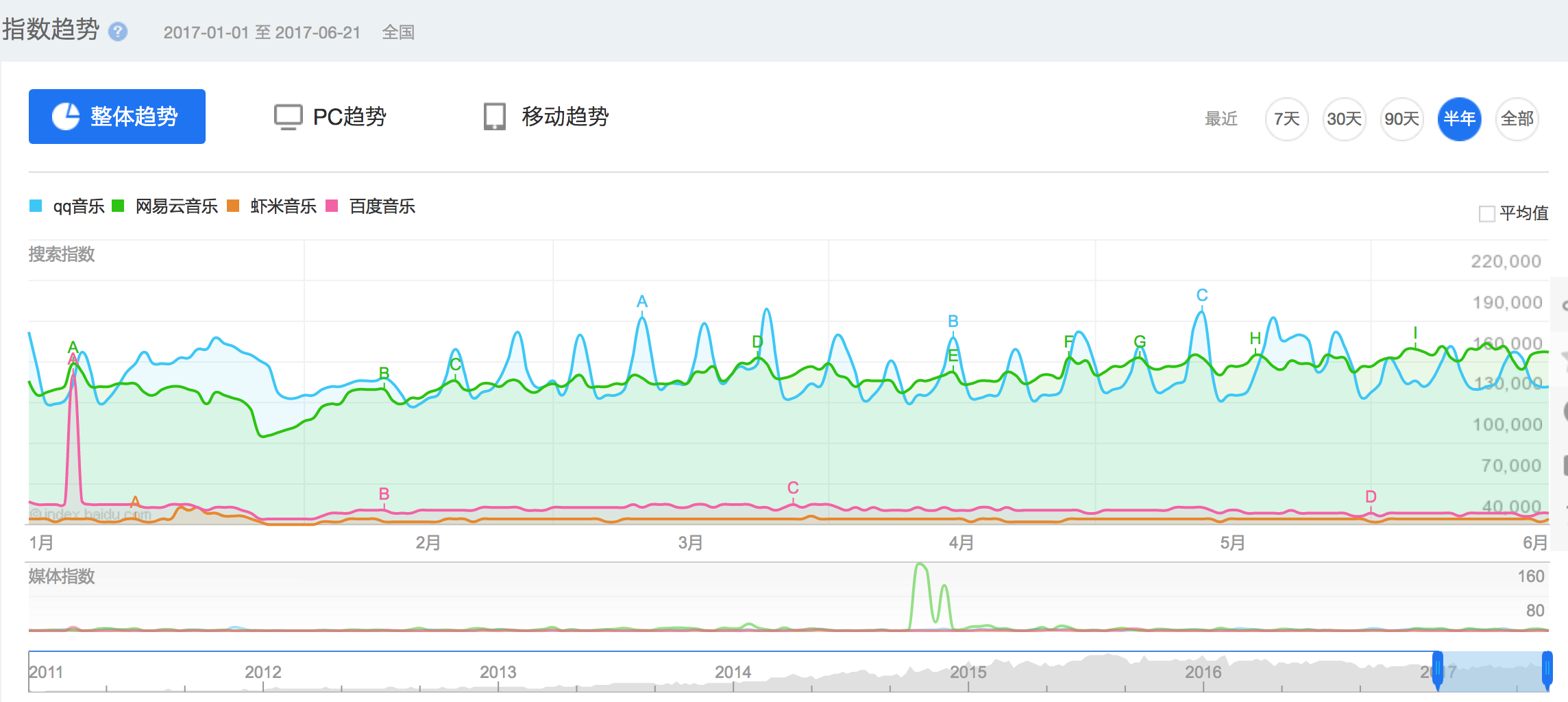 (百度搜索指数:2017上半年,腾讯、网易、阿里、太合)