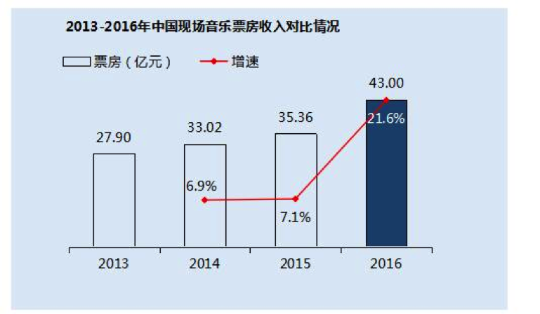 音乐是天然的线上线下模式载体,线下Live、演唱会等形式也是音乐产业重要的收入来源。道略音乐产业研究中心《2016年度中国现场音乐报告》数据显示,2016年现场音乐票房为43亿元,比2015年增加了7.64亿元,涨幅21.6%,达到近4年最高。