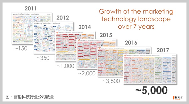从供给端角度来看,大量的营销科技类公司开始出现,按照ChiefMartec.com创始人Scott Brinker统计,截止目前,已经出现近5000家营销科技类企业,其中绝大部分都是近两年冒出来的公司。