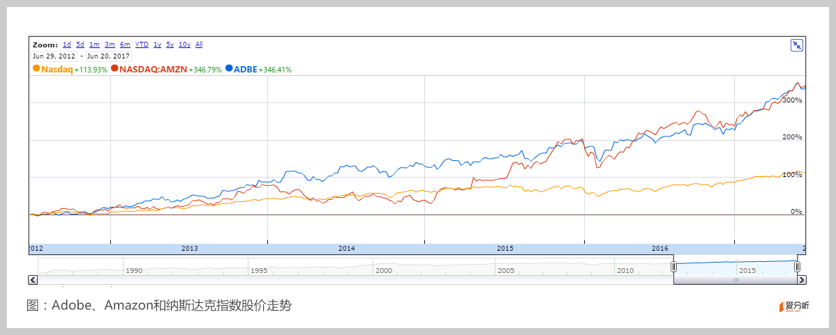 一般来说,业务成熟的公司市值都相对稳定,而Adobe作为一家老牌科技公司,股价在2012年至今这5年间,狂飙了300%,市值从160亿上涨到近700亿美元,上演了一出和Amazon一样的传奇。