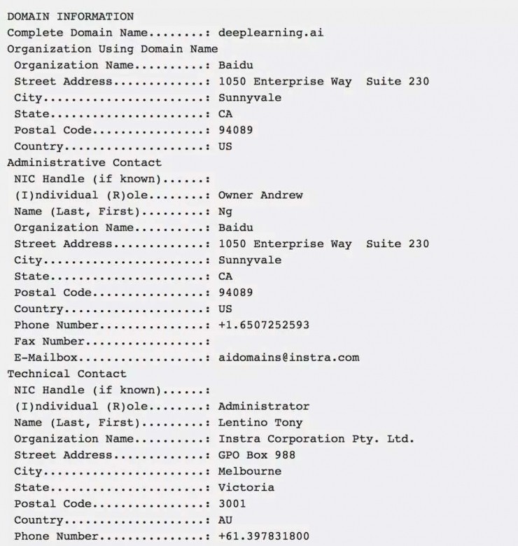 有媒体发现Deeplearning.ai的域名似乎已注册到百度位于硅谷森尼韦尔的研发机构,也是吴恩达此前工作过的相同的办公室。根据从Wayback Machine上获取的数据,该域名由Instra注册,并于2015-2017年之间被认领。