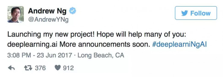钛媒体快讯 | 6月24日消息:吴恩达几个小时前在Twitter上宣布,他建立了一家新的公司:Deeplearning.ai。这位百度前首席科学家用这种方式向外界宣告了自己的回归。