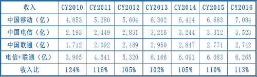从收入规模上看还没有形成较大的失衡(当然,如果再看净利润数据,则2010年到2016的数据,比值最大是651%,最小是354%,但是需要考虑中国移动公司在资产结构等各方面的差异,因此净利润指标的参考性要弱一些)。