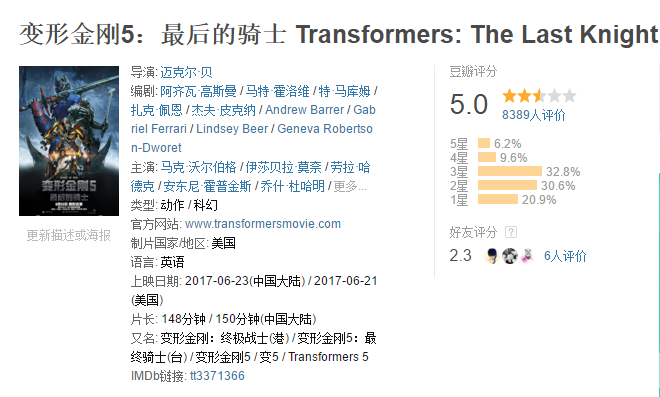 伴随着《变形金刚5》在中国内地连破记录的同时,影片的口碑评价却与票房成绩背道而驰,目前豆瓣评分5.0,是该系列在豆瓣的最差评价,且分数仍有可能继续下跌,与此相同的是,北美评分网站烂番茄的分数是16%,Metacritic是27分,都是该系列最差的分数。