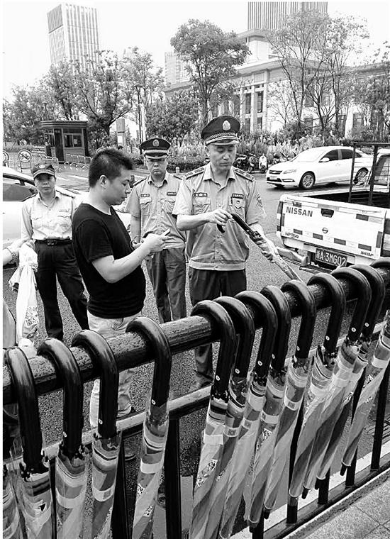 22日下午3点左右,天水中队集中对辖区内的共享雨伞进行了集中清理整改。天水执法中队中队长陈敏奇告诉钱江晚报记者,共享雨伞在户外公共区域投放时,存在占用公共设施的情况。