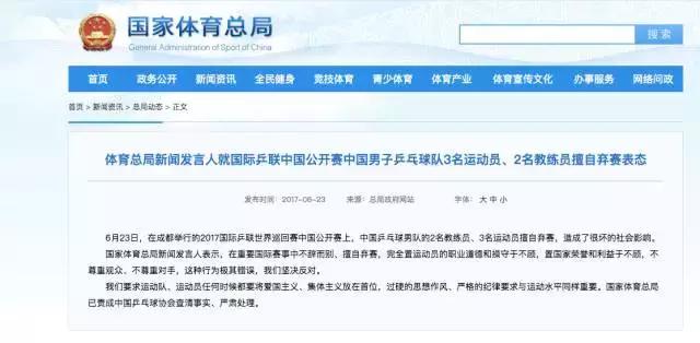 6月23日,国家体育总局就国乒运动员弃赛表态: