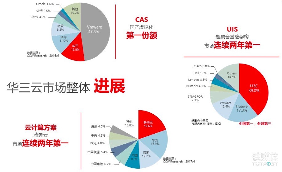 很多人对于新华三的认识还停留在我们是一个做数通的厂家,实际上这几年我们在云、虚拟化以及超融合市场已经做到非常大的市场份额,已经连续两年在中国政务云市场份额排名第一,在计世科技刚刚发布的虚拟化中国市场占有率里面,新华三是仅次于VMware的国产虚拟化产品第一供应商。