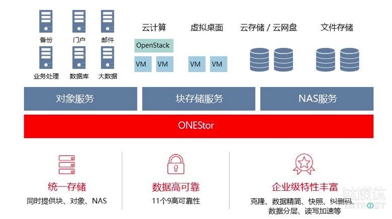在华三的超融合方案中分布式存储解决方案叫ONEStor,为什么叫ONEStor呢?因为我们他能实现统一存储。为什么是统一的存储呢?也就是说我们在一个分布式存储的平台上,可以给用户提供对象,块以及文件服务。
