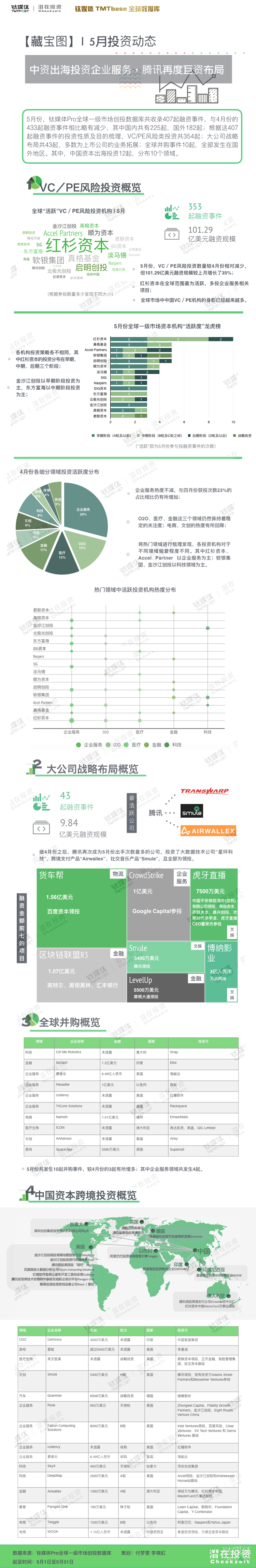 5月份,钛媒体Pro全球一级市场创投数据库共收录407起融资事件,与4月份的433起融资事件相比略有减少,其中国内共有225起,国外182起;根据这407起融资事件的投资性质及目的梳理,VC/PE风险类投资共354起;大公司战略布局共43起,多数为上市公司的业务拓展;全球并购事件10起,全部发生在国外地区。其中,中国资本出海投资12起,分布10个领域。