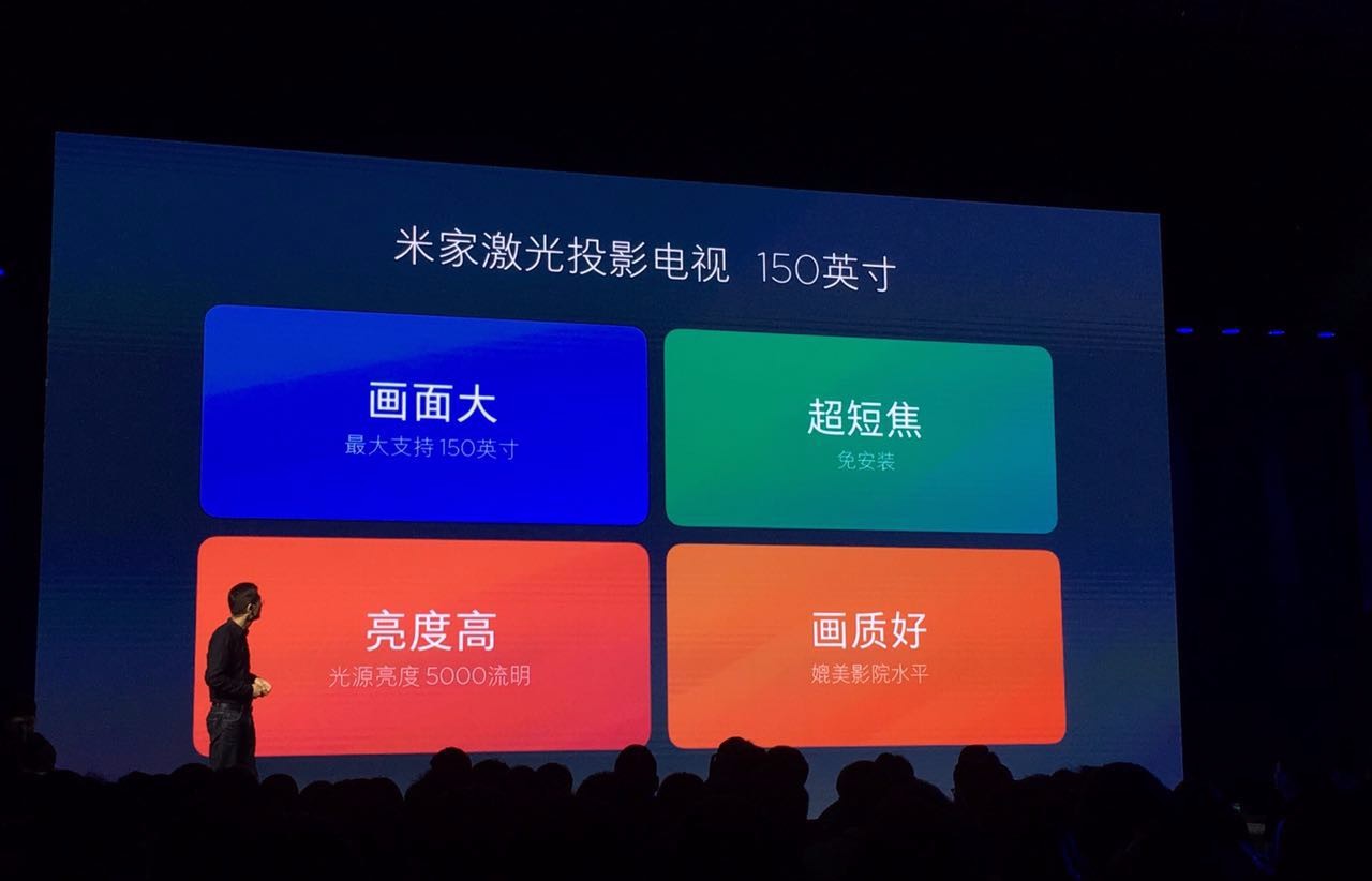 米家激光影院是这次发布会的重点产品,是小米首次涉足激光电视领域。简单来说,米家激光影院采用单片DLP投影技术,可显示80~150寸大小屏幕,分辨率为FullHD 1080p。光源采用ALPD 3.0技术,色轮采用自己研发的RGRGB五色轮。